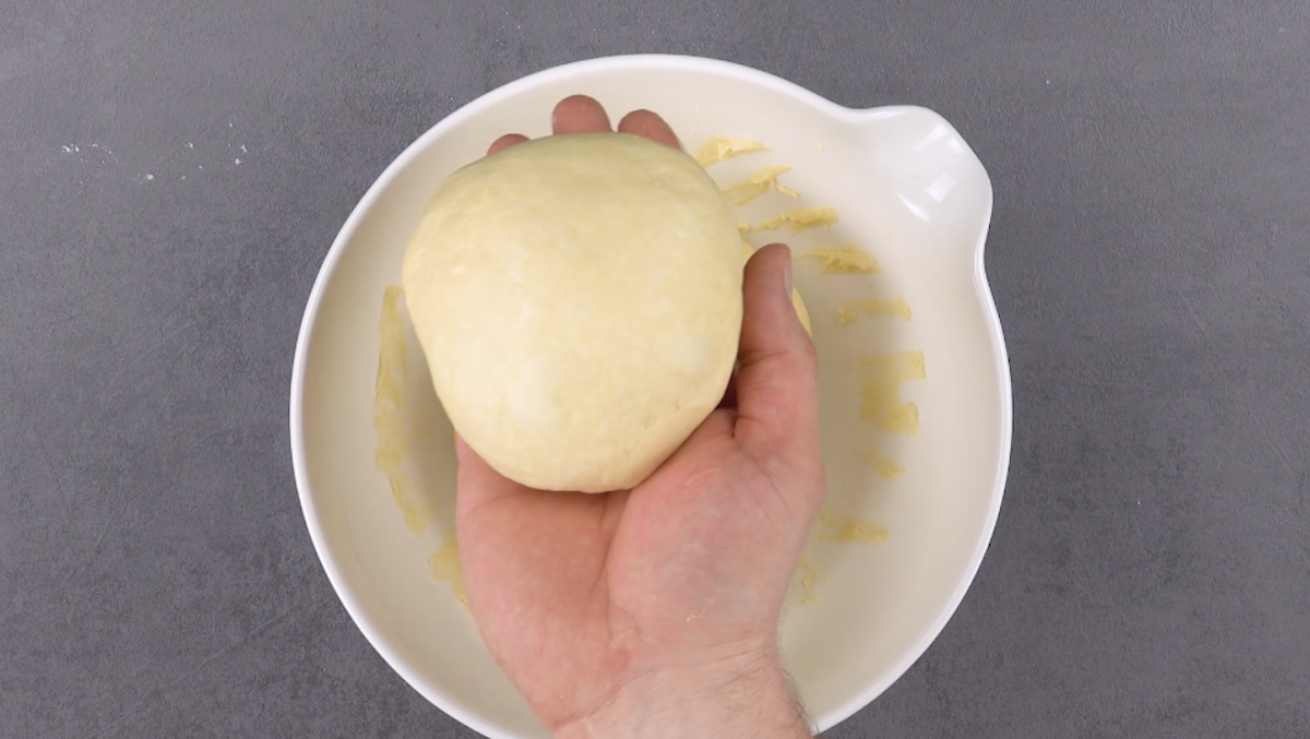 4. Teile den aufgegangenen Teig in zwei ca. 450 g schwere Stücke. Den restlichen Teig legst du erst einmal beiseite.