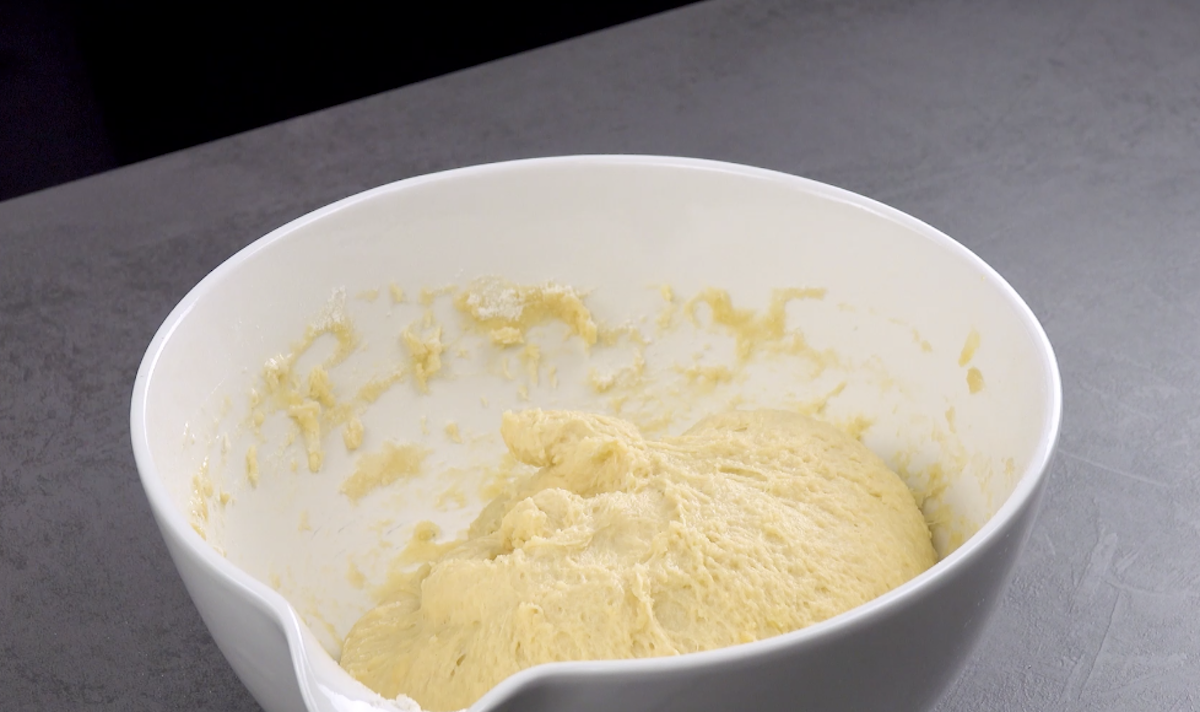 3. Gib dann Eier, Salz und Öl zu dem Vorteig in der Schüssel und verrühre alles mit einem Handrührgerät (mit Knethaken), bis ein glatter Teig entstanden ist. Lasse den Teig abgedeckt an einem warmen Ort ca. 2 Stunden gehen.