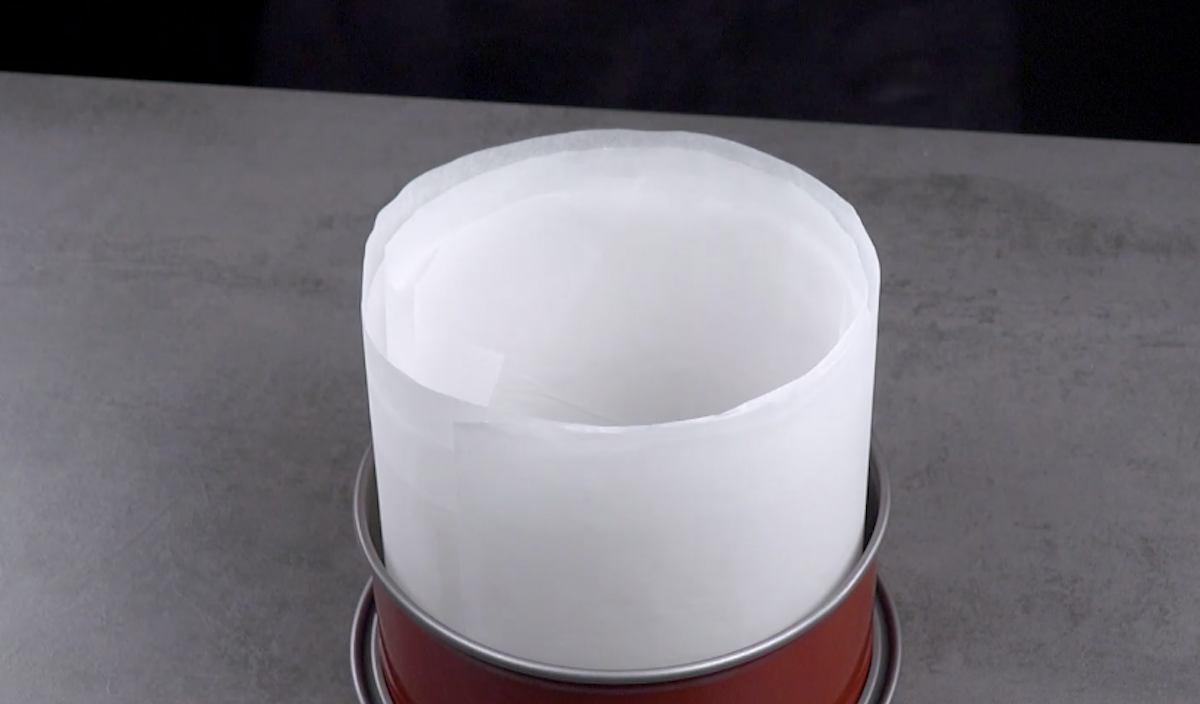 7. Lege in eine Springform Backpapier, sodass es oben großzügig herausguckt.