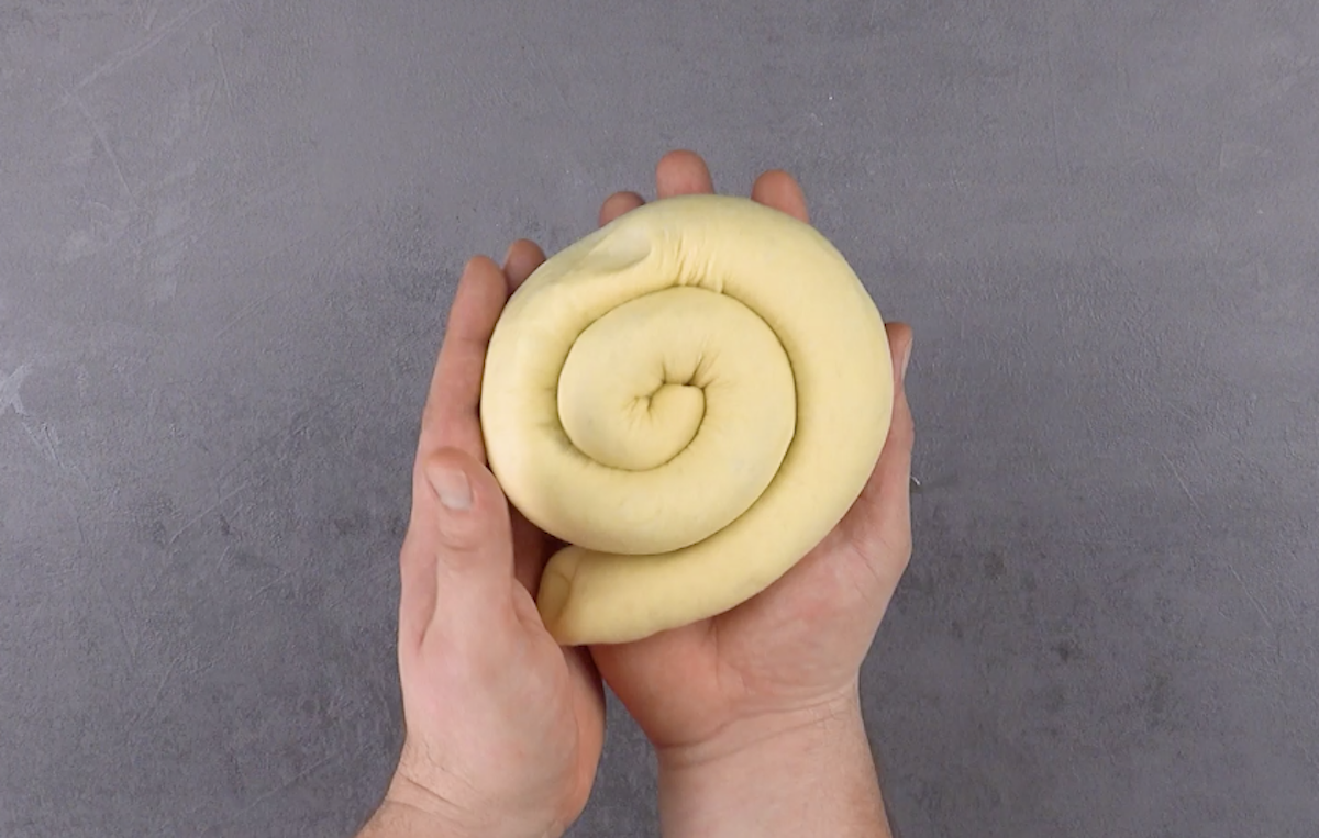 6. Rolle den Teig eng zusammen und dann zu einer schneckenförmigen Spirale auf. Verfahre genauso mit dem zweiten Teigstück.