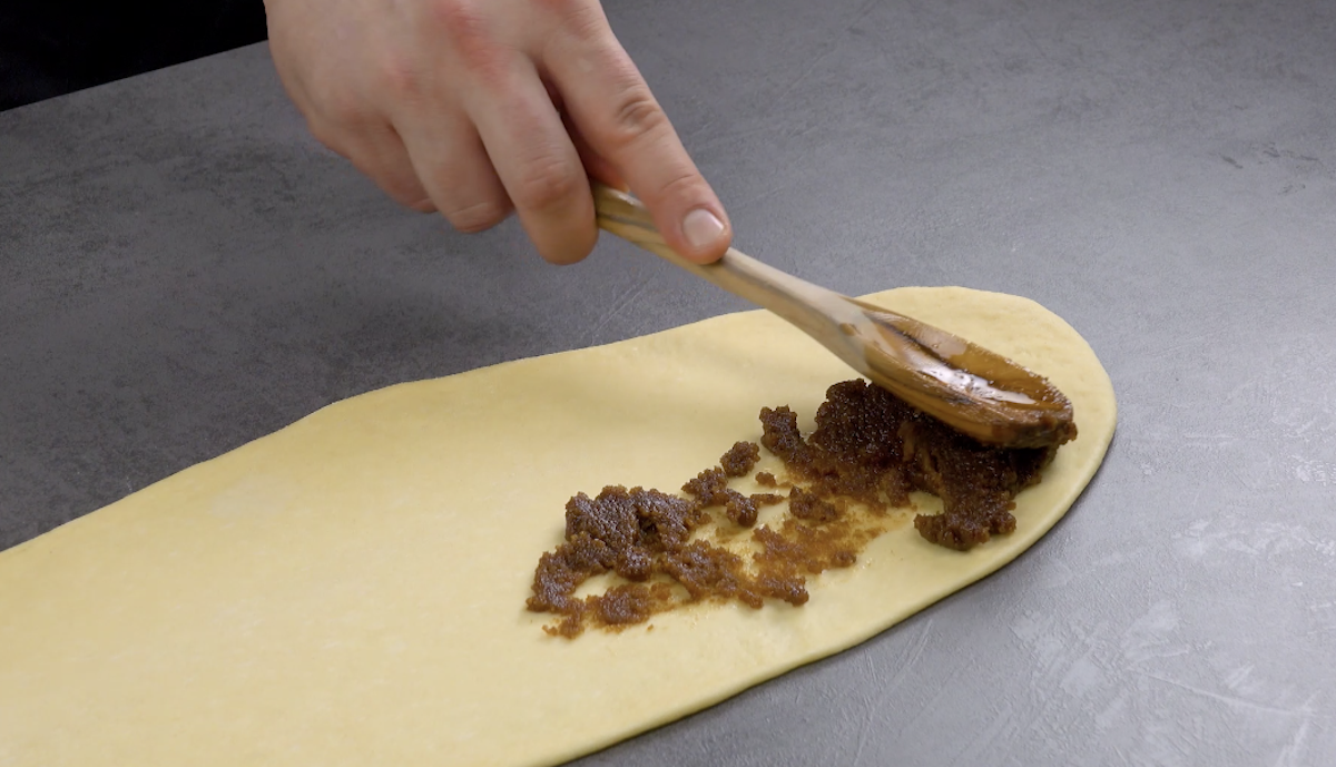 5. Lasse Butter in einem Topf oder in der Mikrowelle schmelzen und gib braunen Zucker und Zimt dazu. Vermische alles gut miteinander. Rolle beide Teigstücke längs aus und bestreiche sie mit der Zimtfüllung.