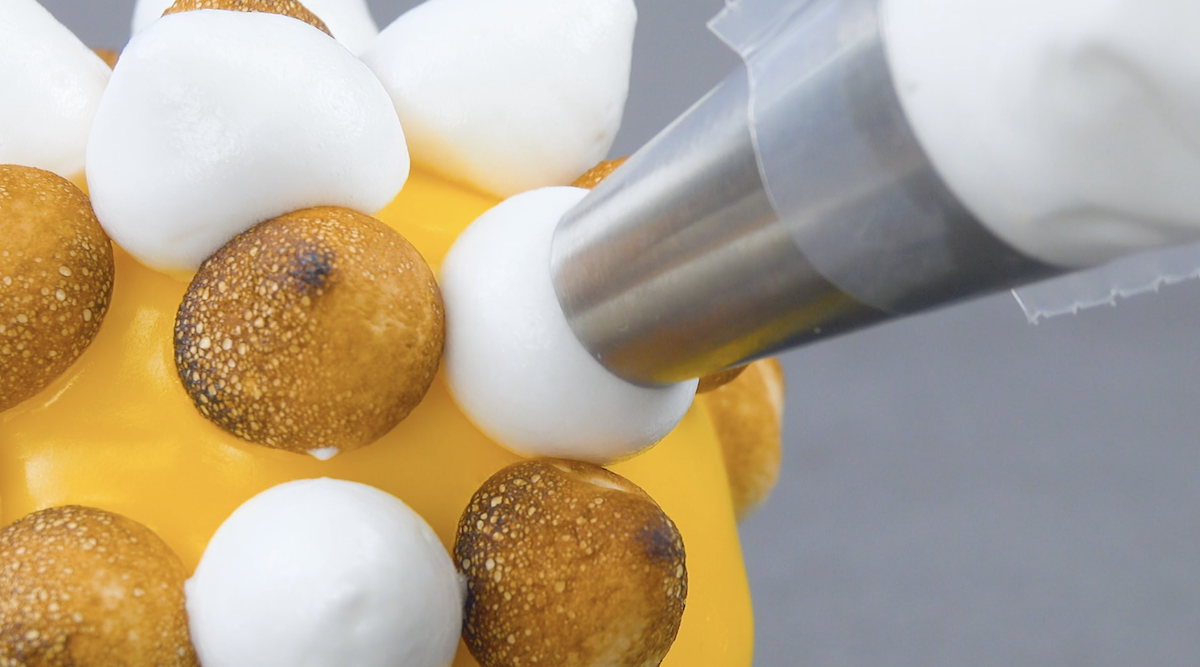 9. Spritze das Baiser tropfenförmig auf die Kugeln und lass dabei immer eine mindestens 1 cm große Lücke zwischen den einzelnen Tropfen. Flämme diese dann vorsichtig mit einem Bunsenbrenner ab. In die Lücken kommen nun noch weitere Baiser-Tropfen.