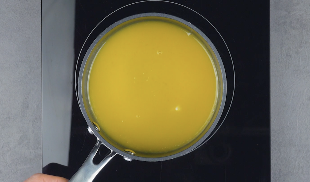 3. Gib Butter, Eigelb, Stärke, Zucker, Zitronensaft (60 ml) in einen Topf und erwärme alles, bis eine dicke Creme entstanden ist. Gib das Lemon Curd nochmals durch ein Sieb. Verteile es dann in drei Mulden der Halbkugelform (Durchmesser: 3,5 cm).