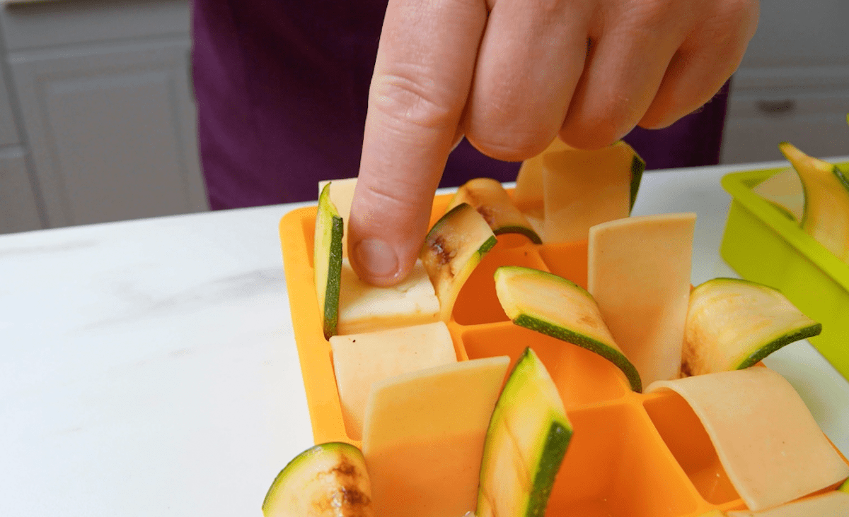 3. Lege immer eine Zucchinischeibe und anschließend quer darauf jeweils eine gekochte Pappardelle in jede zweite Kuhle der Eiswürfelform. Am Ende sollten 10 Kuhlen auf diese Weise belegt sein.