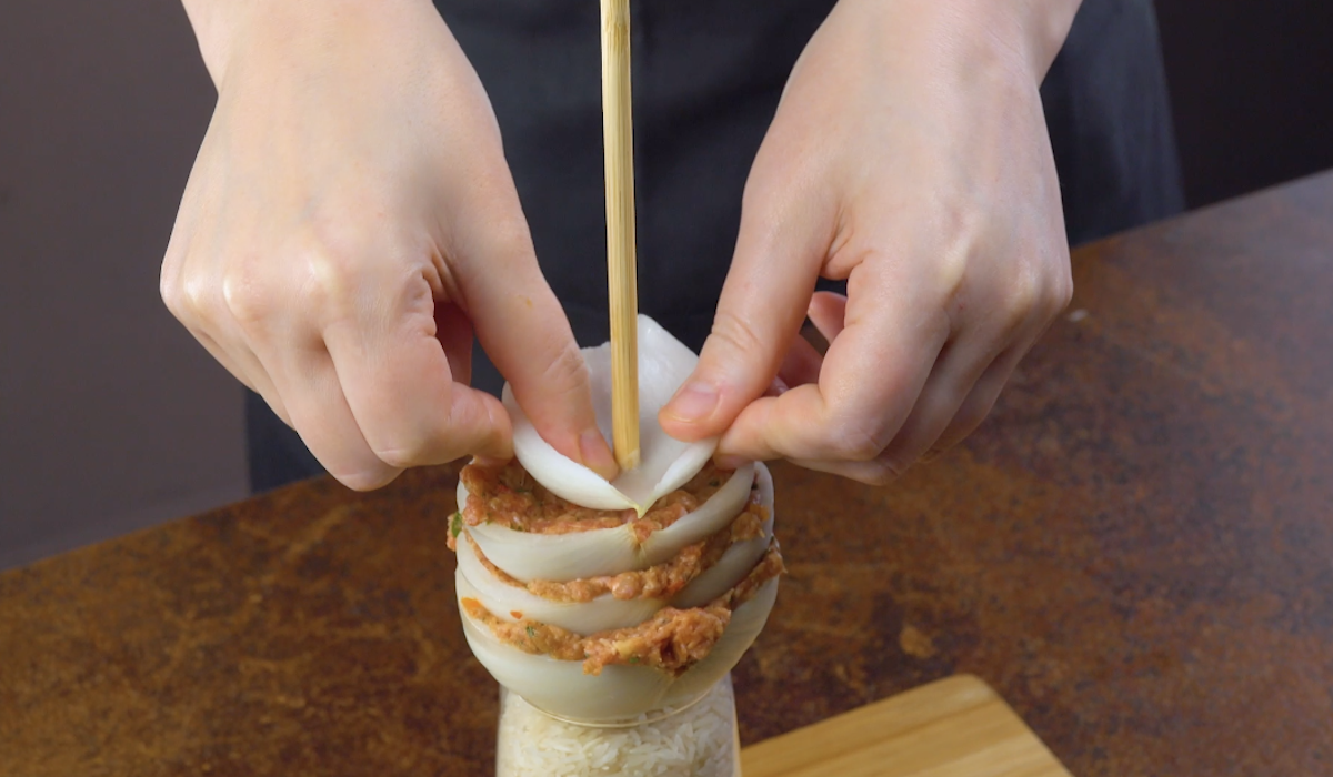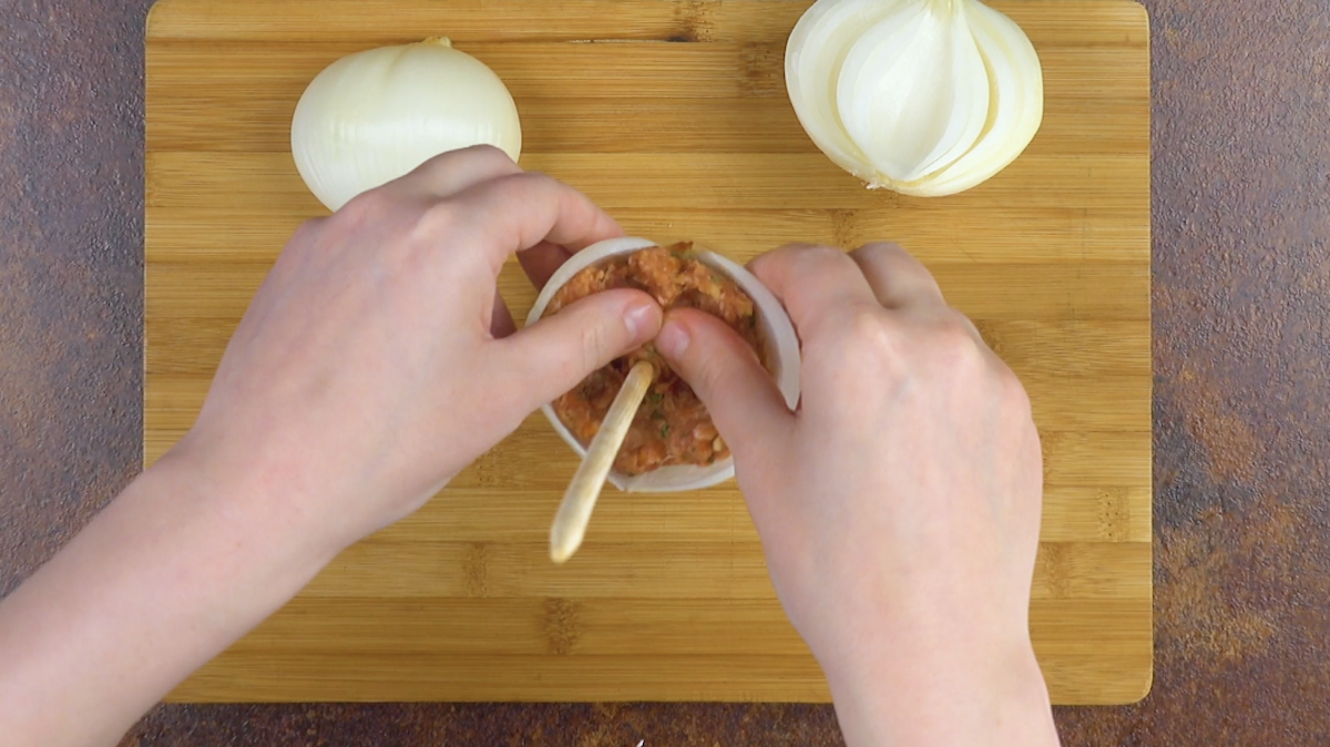 5.) Wiederhole das Aufspießen der Zwiebelschalen und das Auffüllen mit Hackfleisch, bis die erste Hälfte der Zwiebel aufgebraucht ist.