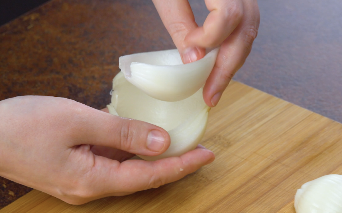 3.) Schäle die große Gemüsezwiebel und halbiere sie. Löse die einzelnen Zwiebelschichten voneinander.
